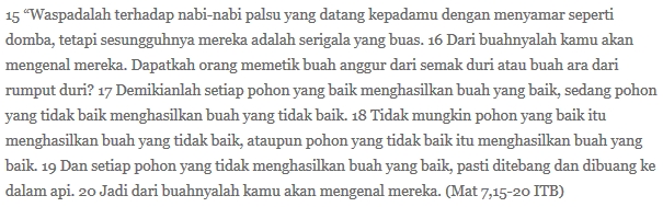 Memang bisa aja buah anggur ada di semak-semak berduri (nyangkut doang), tapi gak berarti untuk menghasilkan anggur orang mesti menanam semak berduri. Begitu pula, Kebenaran, tutur kata dan tindakan yang baik, bisa aja disodorkan oleh orang jahat, tetapi orang jahat pada dasarnya tidak memproduksi Kebenaran. Jadi, buah yang baik diharapkan dari pohon yang baik pula.