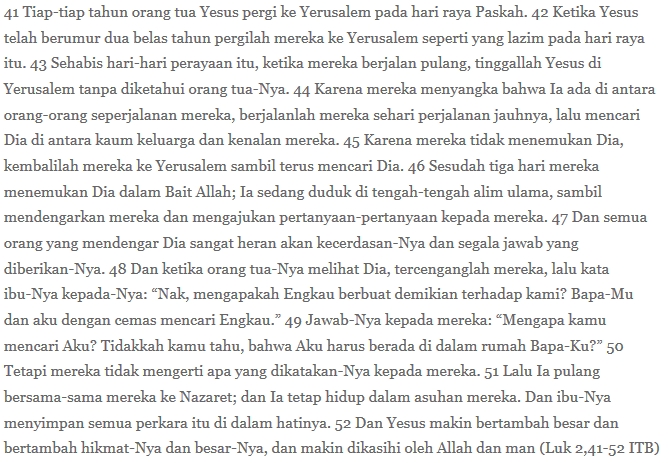 Pada hari raya Paska setelah berumur dua belas tahun itulah Yesus sungguh mempraktikkan kemampuannya untuk menentukan pilihan: ia tinggal bersama para tokoh agama di Bait Allah. Maria dan Yusuf mencari anak mereka dan tak ditemukannya pada para tetangga dan sanak saudara. Ini bukan perjalanan jarak dekat, dan kerumunan orang begitu besar. Yesus tidak mereka temukan juga dalam kerumunan.