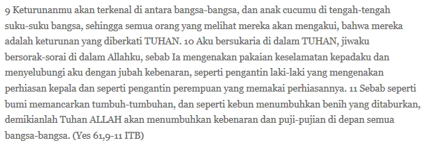 Ada beberapa alternatif bacaan hari ini dan di sini diambil Kitab Yesaya yang memuat pujian atas kemuliaan Allah. Manakah kemuliaan Allah itu? Kemuliaan-Nya tampak pada keselamatan yang diberikan melalui umat pilihan-Nya, seperti pakaian megah yang dikenakan kepada mempelai, seperti bumi merekahkan tumbuhan dari benih yang ditaburkan, barangkali juga seperti energi dari pusat bumi yang bergelora hendak menampakkan diri ke permukaan bumi