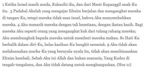 Bagaimana bisa begitu? Bacaan pertama menjadi salah satu landasannya: sejak kecil, sepanjang hidupnya, manusia senantiasa dalam genggaman kasih Allah yang dari ‘hati kecilnya’ tak pernah berniat menghanguskan manusia! Hanya kepada-Nyalah manusia pantas menyandarkan hidupnya, agamanya, bangsa dan negaranya.