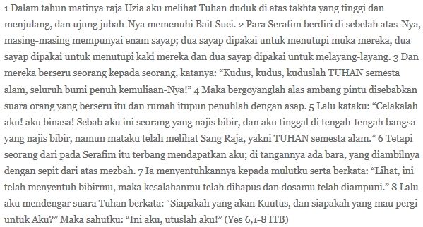 Dalam bacaan pertama disinggung bagaimana Yesaya justru akhirnya dikuatkan untuk keluar dari dirinya sendiri dan membusungkan dada: Ini aku, utuslah aku! Ini bukan pembusungan dada karena kesombongan atau kekuatan diri sendiri, melainkan justru keberanian untuk bergerak dari kepentingan ego menuju tugas perutusan Tuhan. Selagi orang masih berkutat dengan urusan egonya, ia memang layak takut, minder, merasa tak pantas bahkan untuk sekadar berjumpa dengan Tuhan: Celakalah aku! aku binasa! Sebab aku ini seorang yang najis bibir, dan aku tinggal di tengah-tengah bangsa yang najis bibir, namun mataku telah melihat Sang Raja, yakni TUHAN semesta alam.