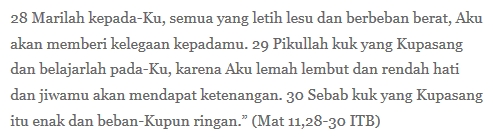 Ternyata oh ternyata, undangan itu ditujukan kepada semua umat beriman yang menjadi budak aneka hukum agama seperti yang disodorkan oleh ahli-ahli taurat (bdk. Luk 11,46: Celakalah kamu juga, hai ahli-ahli Taurat, sebab kamu meletakkan beban-beban yang tak terpikul pada orang, tetapi kamu sendiri tidak menyentuh beban itu dengan satu jaripun). Orang yang menghayati iman secara legalistik sebetulnya mengalami kelelahan. Lihatlah para pemain drama di panggung politik nasional: ada yang lelah karena prihatin, tetapi ada juga yang sebenarnya lelah karena harus mencari jalan keluar untuk menutupi kebenaran.