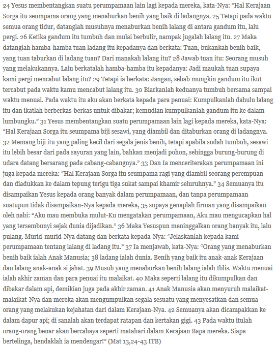 Tugas umat beriman hanyalah mengaktualkan benih baik, menumbuhkan biji sesawi supaya semakin besar, dan menampakkan pengaruh ragi kepada lingkungan sekelilingnya. Soal ada kekuatan lain yang jahat, yang merusak potensi baik Kerajaan Surga itu, malah baik disadari bagaimana kinerjanya (bdk. pembedaan roh). Tetapi bagaimana melenyapkan kekuatan roh jahat, itu nantilah, bukan urusan orang: itu jatahnya Tuhan kelak.