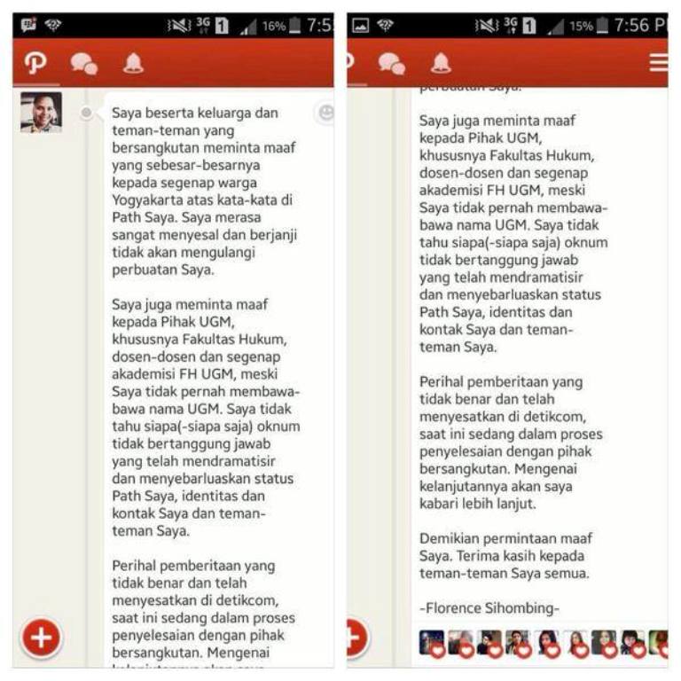 Meskipun dalam pernyataan maafnya masih ada bau-bau mencari kambing hitam, yang berarti kurang rendah hati mengakui bahwa pemicunya adalah dirinya sendiri (andaikan isi Path miliknya tidak ada yang keliru, mau disebarkan ke bulan pun tetap tidak ada masalah), muncul gerakan untuk menerima kesalahan Florence dan tak perlu memprosesnya ke ranah pidana. Bahkan setelah hanya dikenakan wajib lapor pun, petisi pembebasan Florence terus bertambah.