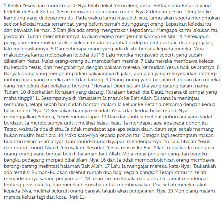 – Mat 21,1-17 / Luk 19,28-48 / Mrk 11,1-19 (Masuk ke Yerusalem)