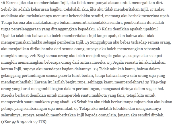 Revolusi mental dimulai dari diri sendiri, dari dalam. Itu yang tersirat dalam bacaan Injil hari ini. Ungkapan “Mengapakah engkau melihat selumbar di dalam mata saudaramu, sedangkan balok di dalam matamu sendiri tidak engkau ketahui?” bisa dipadankan dengan peribahasa “Kuman di seberang lautan tampak, gajah di pelupuk mata tak tampak”. Ungkapan ini ditujukan kepada mereka yang begitu kritis terhadap orang lain, tetapi tak punya sikap otokritik. Celakanya, orang yang mendapat kritik (yang juga kurang rendah hati) bisa memakai ungkapan itu untuk membuat kebal diri: urus aja rumah tangga lu sendiri, gak usah ngurusi rumah tangga orang! Kiranya bacaan hari ini tidak mengajak orang untuk kebal kritik.