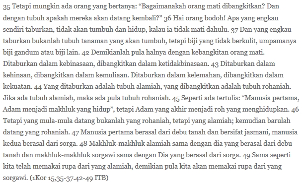 Omong-omong soal kebangkitan badan, siapa yang mau percaya ya? Orang-orang Korintus melontarkan dua pertanyaan: (1) gimana n dengan kekuatan apa kebangkitan bisa terjadi dan (2) kalo orang bangkit, body umur berapa jadinya yang dibangkitkan, waktu umur 80 tahun, 17 tahun, atau waktu separuh umurnya di dunia ini? (Trus gimana nasib yang dikremasi? Jadi hujan abu?) Paulus menjawab santai: hai bego’, apa kamu kira kita ini menaburkan bonsai-bonsai pohon jagung, duren, dan lain-lain supaya pohon-pohon itu berbuah? Itu mah namanya cangkok, Bray! Menabur benih itu ya menabur benih ‘mati’. Nah, gimana mungkin benih ‘mati’ kok malah bikin muncul tanaman baru? Ya jelas karena kekuatan ilahi yang memberinya kehidupan, bukan? Kekuatan ilahi menemukan caranya sendiri untuk menghidupkan yang mati.
