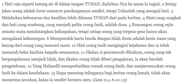 Dalam hati orang yang terbilang sebagai saudara Yesus (yaitu mereka, apapun agamanya, yang mendengarkan Sabda Tuhan dan menjalankannya) sekurang-kurangnya ada niat untuk jadi seperti hati raja dalam Kitab Amsal hari ini: seperti batang air di dalam tangan TUHAN, dialirkan-Nya ke mana Ia ingini. Memang orang kritis mempertanyakan: orang kan bisa klaim bahwa ia mendengarkan Sabda Tuhan. Ini soal menang-menangan klaim aja. Betul, setiap jalan orang adalah lurus menurut pandangannya sendiri, tetapi Tuhanlah yang menguji hati.