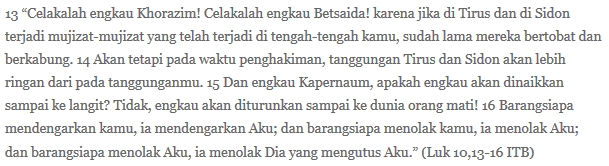Tak mengherankan bahwa Yesus mengecam Betsaida dan Khorazim: orang-orangnya tak terbuka pada kebenaran. Kebenaran apa? Allah yang transenden, yang maha segala sifat baik itu, toh hadir juga dalam dunia ini melalui hal-hal yang tak mutlak, yang serba terbatas. Juga melalui para murid yang ditugasi untuk mewartakan kabar gembira kepada orang-orang pada masa itu.