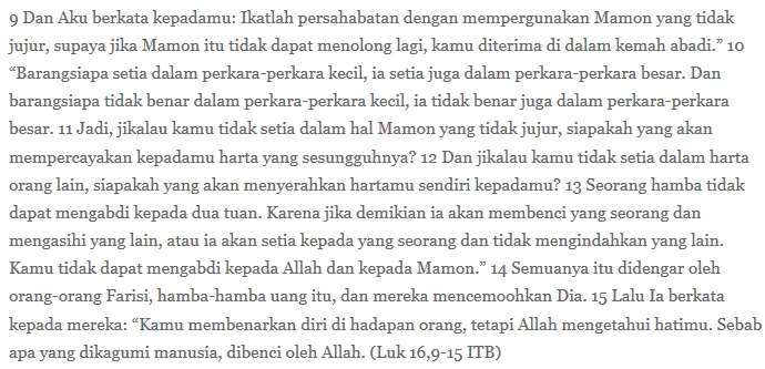 Bacaan Injil hari ini merupakan aplikasi dari bacaan kemarin dan bisa memberi perspektif untuk sedikit memperbaiki tafsir atau inspirasi yang kemarin muncul. Soalnya, kemarin tak begitu dipertimbangkan pertanggungjawaban yang diminta tuan si bendahara itu. Bendahara ya tanggung jawabnya mengelola keuangan tuannya. Lha, pertanggungjawaban apa yang diminta darinya kok kemudian ia mesti dipecat dan lantas dipuji sebagai bendahara yang cerdik?