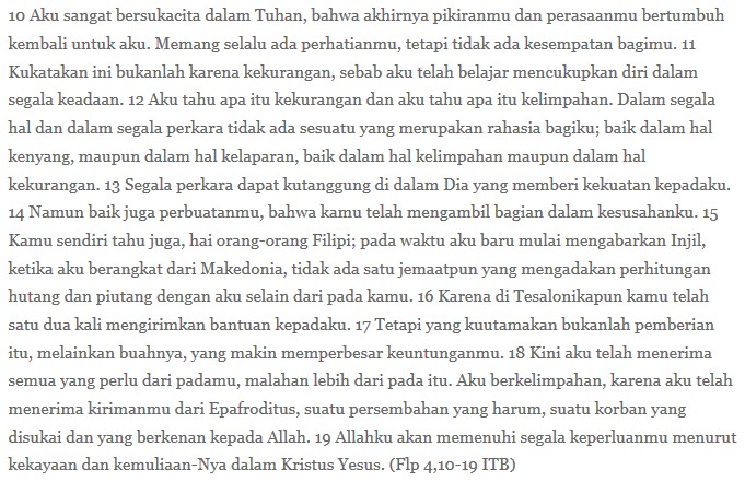 Selain itu, orang perlu belajar dari cara-cara duniawi dengan catatan: perlu jeli melihat mana yang sungguh menjamin kebahagiaan sejati. Injil mendorong orang untuk memikirkan bagaimana lika-liku kemanusiaan bisa menjadi jalan bagi anak-anak terang pula. Bacaan pertama pun memberi keterangan mengenai bantuan yang diterima Paulus. Tentu bantuan itu bersifat duniawi juga tetapi diberikan oleh jemaat secara cuma-cuma dan Paulus tidak menangkapnya pertama-tama sebagai barang fisiknya, melainkan perhatian dan dukungan si pemberi: kalau pemberian itu tulus, tentu juga membuahkan hasil baik bagi si pemberinya sendiri.
