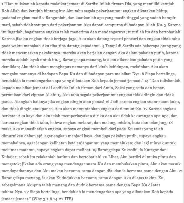 Mungkin bacaan pertama perlu dipertimbangkan: kritik terhadap dua komunitas di Sardis dan Laodikia. Jemaat di Sardis, mereka adalah orang-orang sukses nan kaya, merasa diri hidup dan cukup dengan kekayaan material yang mereka punya. Jemaat di Laodikia, mereka ini kelompok orang yang hangat-hangat tahi ayam.