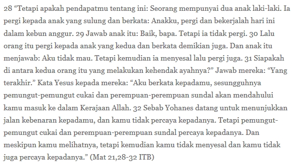 Lah, apa bukannya anak pertama itu bertobat juga? Dia kan bilang ‘siyap!’, tapi justru karena bertobat atas perkataannya lalu gak jadi kerja? Haiya… itu bukan pertobatan! Pertobatan bukan asal beda dari yang dikatakan atau tak jadi mengikuti perkataan dong! Tolok ukur pertobatan ialah bahwa kehendak Allah itu dilaksanakan.