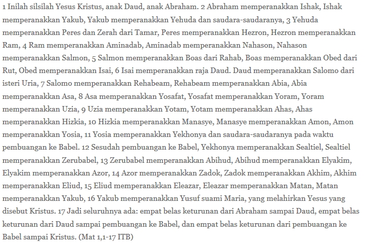Bacaan hari ini termasuk yang saya gak suka. Isinya cuma A memperanakkan B, B memperanakkan C dan seterusnya! Membosankan! Kenapa? Karena berisi nama-nama asing yang tak saya kenal. Hanya sedikit saja nama yang kisahnya saya ingat! Pokoknya, membosankan! Maunya langsung ke kesimpulan. Eh, tenyata kesimpulannya cuma “ada 14 keturunan dari Abraham sampai Daud, 14 keturunan dari Daud sampai pembuangan di Babel, dan 14 keturunan lagi dari masa pembuangan di Babel sampai Kristus.” Malah ngajari berhitung! Njuk ngopo gituloh?!