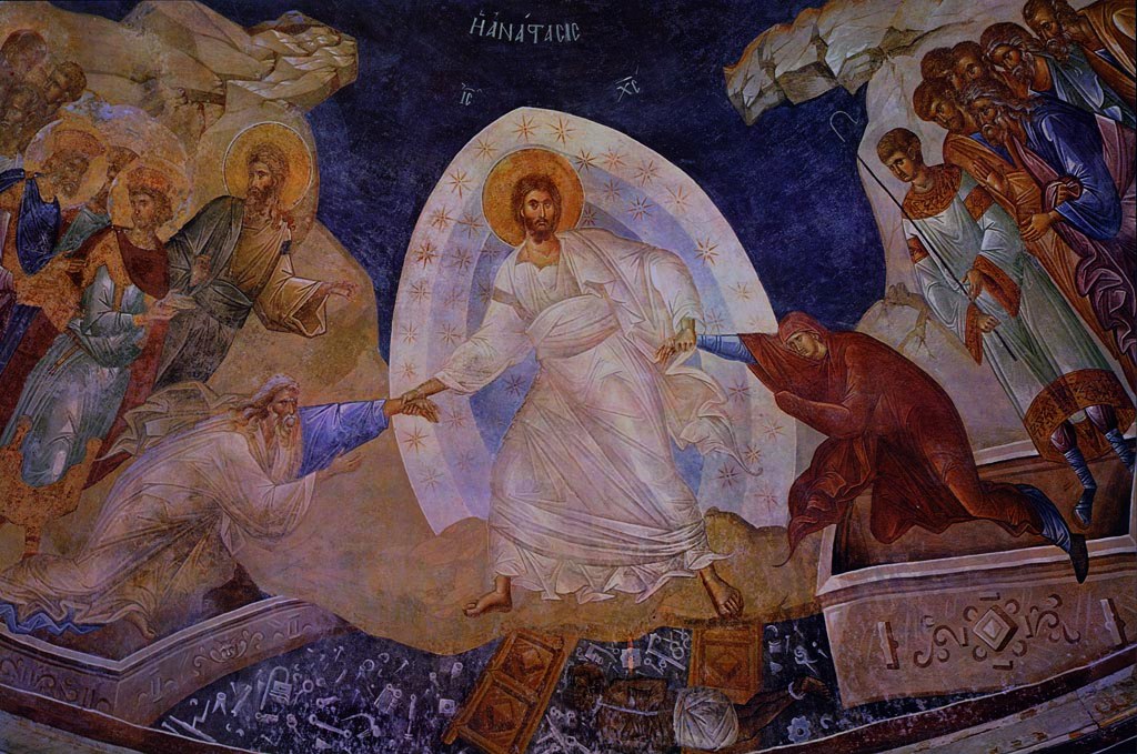 Gambar ini adalah sebuah fresco (bacanya fresko aja ya) pada salah satu Gereja di Istanbul. Sosok di tengah adalah Kristus yang dilingkupi oleh suatu mandorla. Di atas mandorla itu warna gelap, menyiratkan bahwa misteri Allah tetap tak terungkap secara penuh. Kristus berada di atas dunia orang mati dan menarik tangan Adam (kiri) dan Hawa (kanan). Di belakang Adam itu ada Yohanes Pembaptis yang menunjukkan Yesus sebagai anak domba Allah seolah kepada raja-raja Perjanjian Lama: Raja Daud, Salomo, Hizkia, Yosia. Di belakang Hawa yang berbaju merah itu ada para gembala, Nabi Musa dan nabi-nabi lainnya.