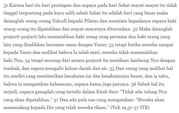 Dengan mata tanpa iman itu orang hanya melihat palang salib sebagai kayu tak berguna, bahkan juga tubuh yang tergantung di situ tak ada maknanya. Orang seperti ini tak tahu bahwa pada tubuh yang tergantung di salib itu terekam sejarah tragedi kehidupan yang melibatkan relasi Allah dan manusia: Allah yang sungguh mengasihi bangsa pilihan-Nya (bacaan pertama) dengan hati-Nya yang begitu luas dan dalam, melampaui pengetahuan manusia (bacaan kedua). Penulis Injil Yohanes menyodorkan deskripsi simbolik atas apa yang terjadi pada tubuh tersalib itu: darah dan air keluar dari lambungnya (bdk. 1Yoh 5,6-8). Air menjadi simbol Roh Kudus pemberi kehidupan dan darah begitu akrab dengan hewan korban Paska bangsa Israel.