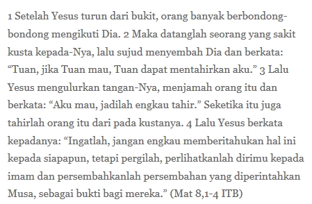 Terhadap rencana Allah, aneka reaksi bisa kita berikan seturut tingkat kepercayaan kita terhadap Allah sendiri, dan dari reaksi itulah juga bergantung bagaimana rencana keselamatan Allah terjadi. Mukjizat yang dibuat Yesus terhadap orang kusta dalam arti tertentu juga menjadi sesuatu yang too good to be true bagi penderitanya. Yesus berpesan supaya orang kusta yang disembuhkan itu tidak berkoar-koar mengenai kesembuhannya. Tentu saja, zaman itu belum ada kamera dan tongsisnya, tetapi permintaan Yesus supaya orang yang sembuh itu tutup mulut bukan semata-mata sebagai larangan untuk selfie.