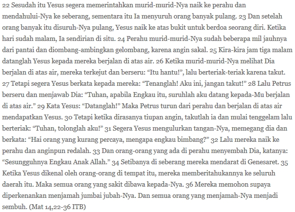 Petrus hendak meyakinkan dirinya bahwa yang menampakkan diri di danau itu bukan hantu, melainkan Yesus. Maka, ia minta bukti: kalau ia menyuruhnya datang mendekat pasti Petrus juga bisa mendekat pada Yesus. Betul saja. Yesus mengundangnya dan Petrus memang berjalan di atas air, tapi waktu angin lebih kuat dan kakinya mulai masuk ke dalam air, ia toh ketakutan.