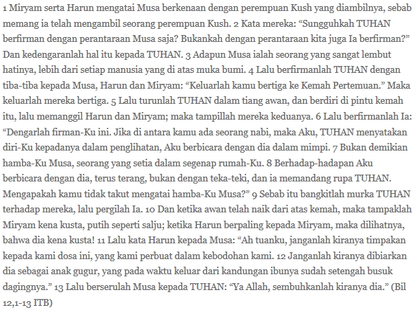 Miriam dan Harun berpikir maju: masak iya Tuhan bicara cuma melalui Musa? Ia pasti bisa dong mewahyukan Diri lewat kita, bahkan kelak orang akan terima bahwa lewat agama lain pun Tuhan menyampaikan kebenaran-Nya! Iya, kan? Jadi kenapa kita mesti bergantung pada Musa ini?
