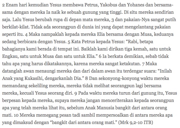 Teks hari ini mengisahkan pengalaman dahsyat beberapa murid Yesus di Gunung Tabor, yaitu ketika Yesus menampakkan kemuliaan Kristus bersama Nabi Elia dan Musa. Sewaktu melihat itu, Petrus campur aduk rasanya lalu menawarkan untuk mendirikan tiga tenda. Dikatakan bahwa Petrus tidak mengerti mau omong apa, tetapi itu bisa dimaklumi karena saat itu adalah hari terakhir ‘Pesta Tenda’ yang populer dirayakan orang Yahudi untuk mengenang turunnya Taurat dan masa terbebasnya mereka perbudakan di Mesir. Kalau tidak bisa bikin tenda selama enam hari, minimal hari terakhir orang bisa melakukannya. Petrus tentu mengingat hukum itu. Maka, ia melontarkan usul untuk mendirikan tiga tenda supaya Yesus bisa melanjutkan bincang-bincangnya dengan Musa dan Elia. Akan tetapi, ternyata tinggal Yesus yang ada di situ. Ini bukan zamannya Musa dan Elia; dan bersamaan dengan itu malah Yesus menyatakan lagi nasibnya bahwa ia akan dibunuh.