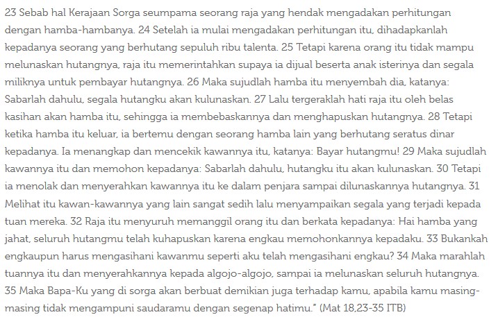 Loh, tetapi kan Yesus sendiri kasih perumpamaan tentang hamba yang jahat pada Injil Matius (18,23-35)? Di hadapan tuannya ia merengek-rengek, tetapi kemudian mencekik bawahannya. Apa itu bukan merendahkan diri di hadapan tuannya dan arogan di hadapan sesamanya? Wah, maaf, itu perumpamaan gak bicara soal kerendahan hati, tetapi soal kemurahan hati dan pengampunan. Pun, kalau mau maksain itu contoh orang rendah hati di hadapan Tuhan dan sombong di hadapan sesama, tidak masuk akal. Orang rendah hati tidak menyimpan agenda tersembunyi dan memperalat pihak lain. Artinya, ia menempatkan dirinya di atas pihak lain, alias pihak lain mesti tunduk padanya, yang belum tentu sungguh baik bagi semua.
