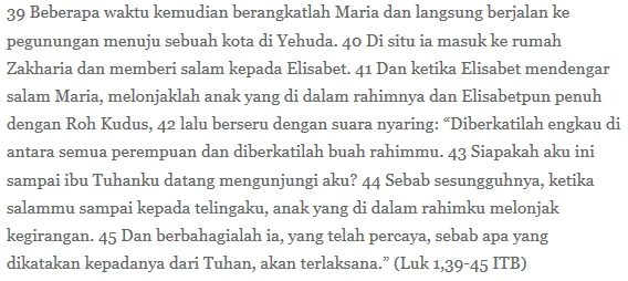 Kemarin sudah didikakatatakan bahwa Lukas mendeskripsikan Maria sebagai tabut perjanjian yang sesungguhnya. Tabut perjanjian merujuk pada lokus kehadiran Tuhan yang dibuat oleh Musa yang memuat loh hukum Allah sendiri (Kel 25,10-21). Tentu tak mungkinlah Tuhan hadir dalam tabut perjanjian seperti perang yang dialami veteran perang tadi! Tuhan tak mungkin dijadikan objek pikiran. Jika Maria adalah tabut perjanjian yang baru, itu berarti bahwa dalam rahimnya hiduplah sosok pribadi yang menghadirkan sosok Allah sendiri. Allah tidak lagi tinggal dalam tabut berisi loh hukum perintah Allah, melainkan tinggal dalam pribadi, dalam hati Maria. Indikator kehadiran Allah dalam hati manusia itu digambarkan dalam bacaan pertama sebagai pujian lantaran roh kegembiraan yang meluap-luap.