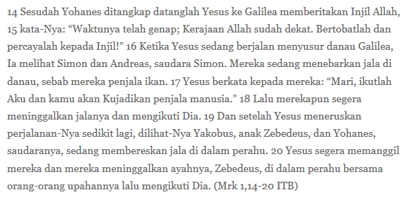 Bacaan kedua mengisahkan kesuburan karena iman itu tadi: para murid dipanggil Yesus untuk melakukan transformasi hidup. Para murid dipanggil Yesus dalam rutinitas biasa ketika. Mereka diundang masuk dalam kesuburan hidup: bukan melulu penjala ikan, melainkan penjala manusia. Lagi, bukan soal barangnya, tapi cintanyalah yang memberi kehidupan; bukan hitung mundur, melainkan ‘hitung maju’ untuk penyebaran kultur kehidupan. Ya mau apa, hidup, bagaimanapun keadaannya, adalah berkat Allah yang perlu disambut juga dengan pertobatan, bukan kemandulan.
