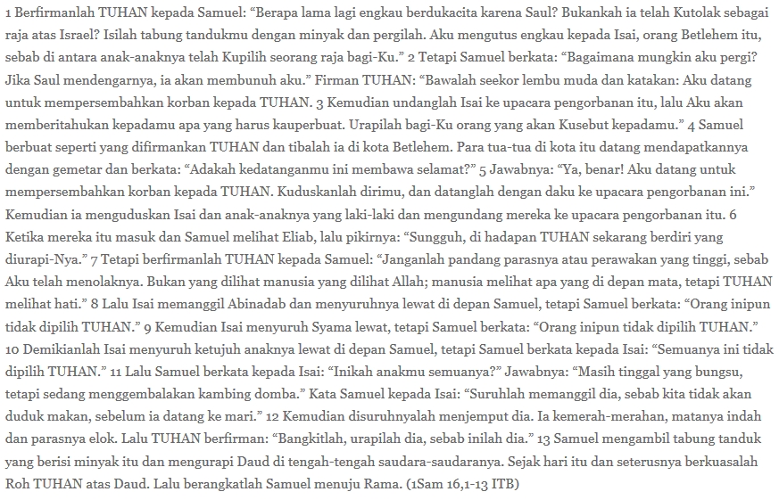 Yesus bisa diberi atribut sebagai pribadi merdeka bukan karena ia anarkis, melainkan justru karena ia mengenali substansi hukum dan tahu bagaimana mengaplikasikannya secara bijak. Ini juga tecermin dalam dialog pada bacaan pertama: Allah menilai bukan atas dasar paras seseorang, melainkan atas dasar hati orang. Penilaian macam ini tak bisa dilakukan jika orang cinta buta terhadap hukum dan tak mampu mengaitkannya dengan nilai kehidupan.