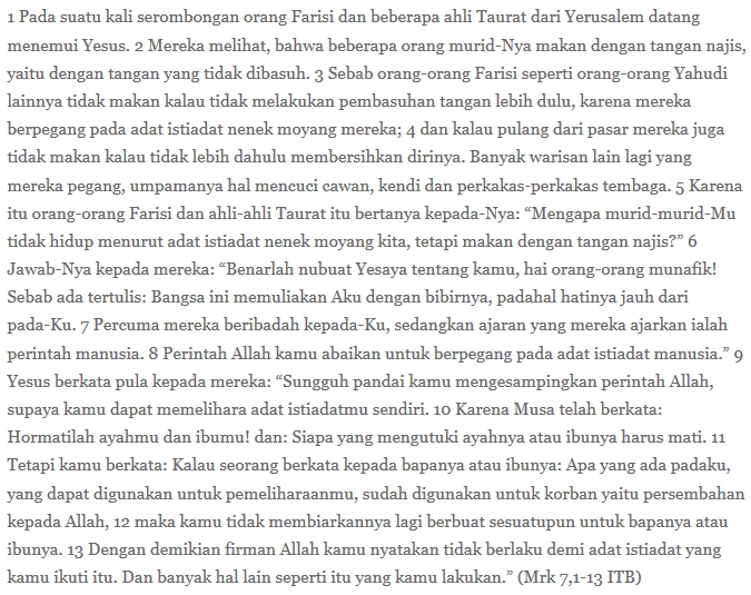 Yesus memberi contoh sederhana. Dalam teks Injil hari ini dikutipkan konflik semu yang jadi tameng bagi ahli Taurat dan orang-orang Farisi untuk membenarkan hidup keagamaan mereka. Hidup keagamaan macam apa? Hidup keagamaan yang ritualistik, munafik, fundamentalistik, fanatik, dan ik-ik lainnya yang tengik! Yang dicontohkan Yesus ialah orang yang mau lepas dari perhatiannya kepada orang tua demi menjalankan ritual keagamaan yang dianggap sebagai satu-satunya jalan untuk menghormati hari Sabat. Maka, sori deh, duit untuk berobatnya sudah kupakai untuk beli daging korban; maap ya, dana hari tua bapak-simbok sudah dipakai untuk membangun tempat ibadat yang megah bagi Tuhan. Tuhan kan lebih penting dari manusia!