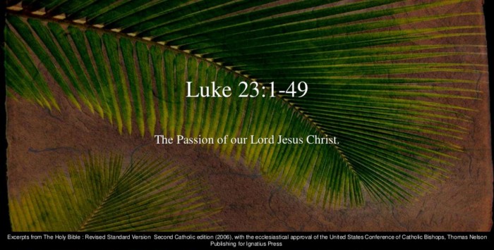 1 Lalu bangkitlah seluruh sidang itu dan Yesus dibawa menghadap Pilatus. 2 Di situ mereka mulai menuduh dia, katanya: “Telah kedapatan oleh kami, bahwa orang ini menyesatkan bangsa kami, dan melarang membayar pajak kepada Kaisar, dan tentang dirinya ia mengatakan, bahwa ia adalah Kristus, yaitu Raja.” 3 Pilatus bertanya kepadanya: “Engkaukah raja orang Yahudi?” Jawab Yesus: “Engkau sendiri mengatakannya.” 4 Kata Pilatus kepada imam-imam kepala dan seluruh orang banyak itu: “Aku tidak mendapati kesalahan apapun pada orang ini.” 5 Tetapi mereka makin kuat mendesak, katanya: “Ia menghasut rakyat dengan ajarannya di seluruh Yudea, ia mulai di Galilea dan sudah sampai ke sini.” 6 Ketika Pilatus mendengar itu ia bertanya, apakah orang itu seorang Galilea. 7 Dan ketika ia tahu, bahwa Yesus seorang dari wilayah Herodes, ia mengirim dia menghadap Herodes, yang pada waktu itu ada juga di Yerusalem. 8 Ketika Herodes melihat Yesus, ia sangat girang. Sebab sudah lama ia ingin melihatnya, karena ia sering mendengar tentang dia, lagipula ia mengharapkan melihat bagaimana Yesus mengadakan suatu tanda. 9 Ia mengajukan banyak pertanyaan kepada Yesus, tetapi Yesus tidak memberi jawaban apapun. 10 Sementara itu imam-imam kepala dan ahli-ahli Taurat maju ke depan dan melontarkan tuduhan-tuduhan yang berat terhadap dia. 11 Maka mulailah Herodes dan pasukannya menista dan mengolok-olokkan dia, ia mengenakan jubah kebesaran kepadanya lalu mengirim dia kembali kepada Pilatus. 12 Dan pada hari itu juga bersahabatlah Herodes dan Pilatus; sebelum itu mereka bermusuhan. 13 Lalu Pilatus mengumpulkan imam-imam kepala dan pemimpin-pemimpin serta rakyat, 14 dan berkata kepada mereka: “Kamu telah membawa orang ini kepadaku sebagai seorang yang menyesatkan rakyat. Kamu lihat sendiri bahwa aku telah memeriksanya, dan dari kesalahan-kesalahan yang kamu tuduhkan kepadanya tidak ada yang kudapati padanya. 15 Dan Herodes juga tidak, sebab ia mengirimkan dia kembali kepada kami. Sesungguhnya tidak ada suatu apapun yang dilakukannya yang setimpal dengan hukuman mati. 16 Jadi aku akan menghajar dia, lalu melepaskannya.” 17 (Sebab ia wajib melepaskan seorang bagi mereka pada hari raya itu.) 18 Tetapi mereka berteriak bersama-sama: “Enyahkanlah dia, lepaskanlah Barabas bagi kami!” 19 Barabas ini dimasukkan ke dalam penjara berhubung dengan suatu pemberontakan yang telah terjadi di dalam kota dan karena pembunuhan. 20 Sekali lagi Pilatus berbicara dengan suara keras kepada mereka, karena ia ingin melepaskan Yesus. 21 Tetapi mereka berteriak membalasnya, katanya: “Salibkanlah dia! Salibkanlah dia!” 22 Kata Pilatus untuk ketiga kalinya kepada mereka: “Kejahatan apa yang sebenarnya telah dilakukan orang ini? Tidak ada suatu kesalahanpun yang kudapati padanya, yang setimpal dengan hukuman mati. Jadi aku akan menghajar dia, lalu melepaskannya.” 23 Tetapi dengan berteriak mereka mendesak dan menuntut, supaya ia disalibkan, dan akhirnya mereka menang dengan teriak mereka. 24 Lalu Pilatus memutuskan, supaya tuntutan mereka dikabulkan. 25 Dan ia melepaskan orang yang dimasukkan ke dalam penjara karena pemberontakan dan pembunuhan itu sesuai dengan tuntutan mereka, tetapi Yesus diserahkannya kepada mereka untuk diperlakukan semau-maunya. 26 Ketika mereka membawa Yesus, mereka menahan seorang yang bernama Simon dari Kirene, yang baru datang dari luar kota, lalu diletakkan salib itu di atas bahunya, supaya dipikulnya sambil mengikuti Yesus. 27 Sejumlah besar orang mengikuti dia; di antaranya banyak perempuan yang menangisi dan meratapi dia. 28 Yesus berpaling kepada mereka dan berkata: “Hai puteri-puteri Yerusalem, janganlah kamu menangisi aku, melainkan tangisilah dirimu sendiri dan anak-anakmu! 29 Sebab lihat, akan tiba masanya orang berkata: Berbahagialah perempuan mandul dan yang rahimnya tidak pernah melahirkan, dan yang susunya tidak pernah menyusui. 30 Maka orang akan mulai berkata kepada gunung-gunung: Runtuhlah menimpa kami! dan kepada bukit-bukit: Timbunilah kami! 31 Sebab jikalau orang berbuat demikian dengan kayu hidup, apakah yang akan terjadi dengan kayu kering?” 32 Dan ada juga digiring dua orang lain, yaitu dua penjahat untuk dihukum mati bersama-sama dengan dia. 33 Ketika mereka sampai di tempat yang bernama Tengkorak, mereka menyalibkan Yesus di situ dan juga kedua orang penjahat itu, yang seorang di sebelah kanannya dan yang lain di sebelah kirinya. 34 Yesus berkata: “Ya Bapa, ampunilah mereka, sebab mereka tidak tahu apa yang mereka perbuat.” Dan mereka membuang undi untuk membagi pakaiannya. 35 Orang banyak berdiri di situ dan melihat semuanya. Pemimpin-pemimpin mengejek Dia, katanya: “Orang lain ia selamatkan, biarlah sekarang ia menyelamatkan dirinya sendiri, jika ia adalah Mesias, orang yang dipilih Allah.” 36 Juga prajurit-prajurit mengolok-olokkan dia; mereka mengunjukkan anggur asam kepadanya 37 dan berkata: “Jika engkau adalah raja orang Yahudi, selamatkanlah dirimu!” 38 Ada juga tulisan di atas kepalanya: “Inilah raja orang Yahudi”. 39 Seorang dari penjahat yang di gantung itu menghujat dia, katanya: “Bukankah engkau adalah Kristus? Selamatkanlah dirimu dan kami!” 40 Tetapi yang seorang menegor dia, katanya: “Tidakkah engkau takut, juga tidak kepada Allah, sedang engkau menerima hukuman yang sama? 41 Kita memang selayaknya dihukum, sebab kita menerima balasan yang setimpal dengan perbuatan kita, tetapi orang ini tidak berbuat sesuatu yang salah.” 42 Lalu ia berkata: “Yesus, ingatlah akan aku, apabila engkau datang sebagai Raja.” 43 Kata Yesus kepadanya: “Aku berkata kepadamu, sesungguhnya hari ini juga engkau akan ada bersama-sama dengan aku di dalam Firdaus.” 44 Ketika itu hari sudah kira-kira jam dua belas, lalu kegelapan meliputi seluruh daerah itu sampai jam tiga, 45 sebab matahari tidak bersinar. Dan tabir Bait Suci terbelah dua. 46 Lalu Yesus berseru dengan suara nyaring: “Ya Bapa, ke dalam tangan-Mu kuserahkan nyawaku.” Dan sesudah be