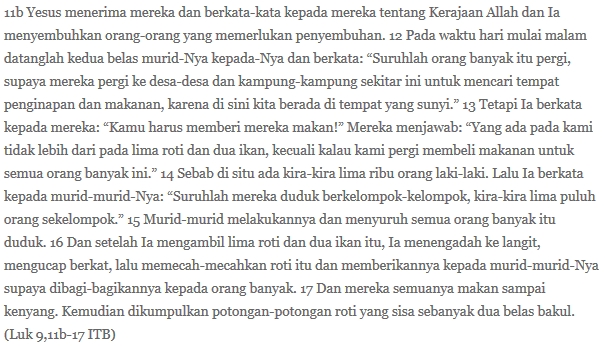Yesus menolak proposal itu. Kerajaan Allah bukan mekanisme pasar dengan dasar hukum penawaran dan permintaan. Pemenuhan kebutuhan dasar orang banyak itu mesti ditata. Kalau tidak, ya mesti perangnya, karena perut kenyang memuaskan binatang, tetapi tak pernah memuaskan keinginan orang. Para murid mesti melibatkan diri di situ!