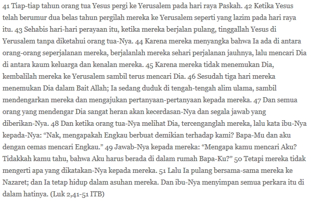 Kalimat terakhir dalam teks Injil hari ini bagi sebagian orang memiliki kesan yang begitu kuat: Ibunya [yaitu Maria] menyimpan semua perkara itu di dalam hatinya. Catatan itu disampaikan penulis Injil Lukas setelah orang tua Yesus kebingungan mencari anaknya pada hari raya Paska. Mereka mesti bolak-balik ke Yerusalem untuk mencari anak tunggal mereka dan ketika berhasil menemukannya, mereka bertanya,”Kok tega-teganya kamu melakukan ini, Nak? Ayah ibumu cemas memikirkanmu!” Dasar sableng, bukannya minta maaf, malah balik menegur,”Loh kamu sekalian harusnya tahu dong di mana aku berada.”