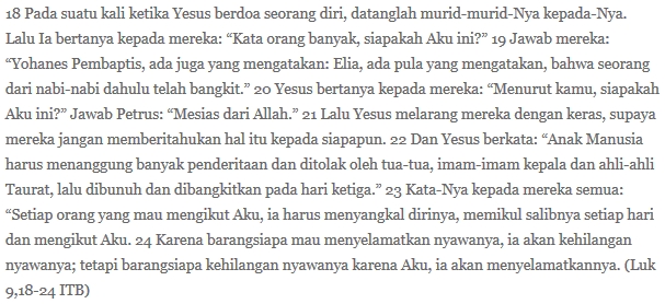 Pun dalam wanti-wantinya hari ini dia kan mengatakan: barangsiapa mau mengikuti aku… Artinya: kalau mau mengikuti aku! Entah mau mengikuti aku lewat cara apapun, prinsipnya ya ini: kamu mesti mengambil salibmu dan memikulnya. Maka, entah jadi guru, jadi kuli, jadi pertapa, pilih agama Katolik, Islam, Hindu, Budha, dll… terserah, sumonggoooo! Pokoknya, kalau orang mengikuti panggilan yang disodorkan Yesus ini, ia memang mesti mengambil salibnya sendiri dan memikulnya (juga sendiri). Gak usah repot membandingkan salibnya dengan salib orang lain. Gak usah pusing mikir kenapa di agama lain enak, kenapa di negara lain bebas, kenapa di provinsi lain begini beginu…