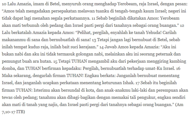 Ini gak cuma terjadi di ranah politik praktis di negeri tercinta, tetapi juga pada ranah sakral bangsa Israel. Seorang imam bernama Amazia hendak menjatuhkan nabi Amos yang menubuatkan kehancuran raja dan Israel. Ia menyebut Amos sedang melakukan makar dan mengusirnya dari Betel,”Sana cari makan di luar, jangan di tempat suci sini!” Amazia menegaskan bahwa Betel adalah tempat suci raja, bait suci kerajaan Israel. Amazia lupa bahwa sebetulnya dia sendirilah yang mengawinkan kepentingan ekonomis dengan legitimasi religius dan politik busuk kerajaan Yerobeam. Ia memproyeksikannya kepada Amos. Ia seperti picek alias buta terhadap kenyataan bahwa Amos sama sekali tak memakai fasilitas kerajaan untuk menyampaikan nubuatnya.