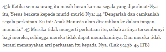 Tak mengherankan juga bahwa murid-murid Yesus cuma plonga-plongo terhadap pernyataan guru mereka,”Anak Manusia akan diserahkan ke dalam tangan manusia.” Seilahi-ilahinya Tuhan, kalau mesti merasuk dalam kemanusiaan, Ia pasti dibantai oleh aneka sikut-sikutan politik. Itulah yang sulit dimengerti oleh murid-murid Yesus. Mestinya keilahian itu mengatasi hiruk pikuk perang kepentingan manusia, lha ini kok malah dibilang ‘diserahkan ke dalam tangan manusia’!