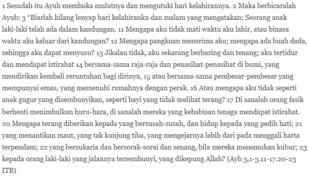 Yesus ini rada-rada gak waras: naik ke Yerusalem justru karena sadar dia akan ‘disembelih’ di Yerusalem. Ia akan dihabisi di sana oleh orang-orang yang sudah sejak lama membencinya, mengincarnya. ‘Penghabisan’ ini kadang dirindukan sebagian orang karena tak tahan aneka teror dan beban hidup mereka: inginnya lenyap saja dari dunia ini, menghilang, lesap, tak terlihat oleh orang lain. Begitu juga jalan pikiran yang ada dalam benak Ayub: ngapain juga hidup kalau cuma menjalani rentetan nasib sial atau penderitaan!