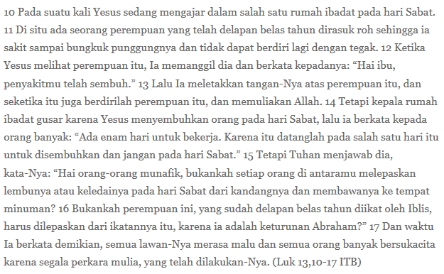 Bukankah justru dengan pembebasan perempuan dari beban hidupnya selama 18 tahun itu dia menegaskan semangat atau roh dari hukum Sabat sendiri: kebebasan manusia untuk memuliakan Allah dengan kepenuhan hidupnya? Yesus memberi makna sejati kepada hukum Sabat yang begitu dihormati oleh kepala rumah ibadat. Norma hukum Sabat tentu penting, tetapi pribadi-pribadi manusia yang ditatanya tentu lebih penting lagi. Ini bukan soal setiap orang dengan seenak-enaknya melanggar hukum, yang justru pelecehan terhadap kemanusiaan sendiri. Ini soal mengembalikan hukum kepada fungsi asalinya: menjamin kebebasan manusia di hadapan Allah.