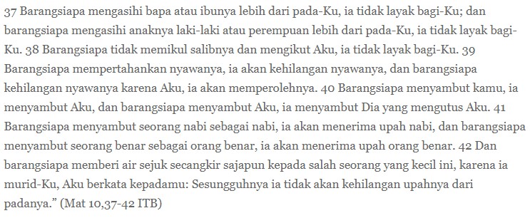 Tak mengherankan, Yesus juga mengatakan bahwa mereka yang mengasihi bapak simboknya lebih daripada Allah, tak pantas bagi proyek mengikuti Kristus. Bapak simbok bisa diganti dengan berhala-berhala lain: tetangga, artis, jabatan politik, pemuka agama, tokoh radikal, dan sebagainya. Pada kenyataannya, inilah yang membuat hidup amburadul: orang nyinyir dengan relasi horisontal dan kehilangan referensi pada relasi autentik dengan Allahnya.