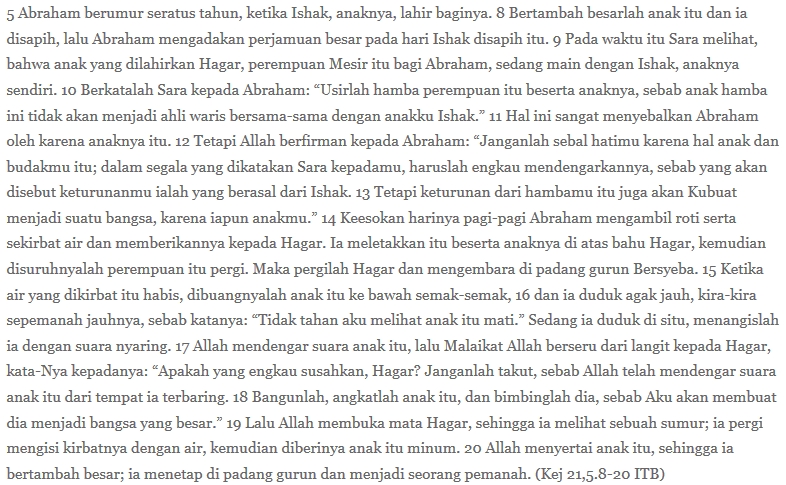 Tentu saya jelaskan juga padanya bahwa Allah akan menjadikan anak Hagar itu sebagai cikal bakal bangsa yang besar juga karena memang begitulah sifat Allah. Orang yang tertindas berseru dan Tuhan menyelamatkan dia dari deritanya. Kiranya Hagar juga berseru dan ia menderita sampai tak tahan melihat anaknya bakal mati. Allah membebaskan dia dari derita itu dan memampukannya untuk merealisasikan janji Allah itu.