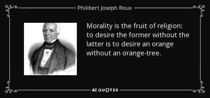 Mungkin baik juga diperhatikan apa yang disampaikan dalam featured image dari posting ini: Morality is the fruit of religion; to desire the former without the latter is to desire an orange without an orange-tree. Itu tidak untuk diperdebatkan, tetapi untuk dicecap-cecap, disimak, ditimbang-timbang.