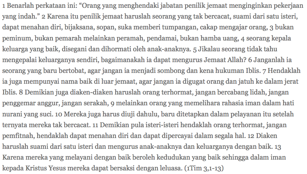Transformasi ini barangkali juga bisa dimengerti dari bacaan pertama. Isinya kan kriteria yang diberikan Paulus untuk memilih orang yang bisa jadi pemimpin dan di situ dikesankan bahwa pemimpin itu tidak pertama-tama berkenaan dengan kemampuan manajerial. Hanya disebutkan soal kecakapan mengajar (dengan tetek bengek silabus, RKS, RPP dan lembar evaluasainya barangkali) dan mengepalai keluarga. Jauh lebih banyak disinggung soal karakter pemimpin: integritas moral dan kualitas pribadi yang bisa diteladan, bukan pemabuk, menduakan istri (tentu juga berarti menduakan suami), dan seterusnya. Singkat kata, pribadi yang transformatif itu lebih menunjuk pada karakter mulia daripada ketrampilan tingkat dewa.