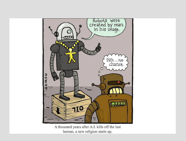 Alasannya tentu jelas: robot bisa diminta apa saja, diperintah apa saja, diperlakukan semau orangnya. Saya kira Allah bukan sosok macam itu, baik sebagai robot maupun pencipta robotnya. Manusialah yang menciptakan robot, menciptakan agama, tetapi dengan sontoloyonya mengklaim itulah Allah. Dalam ekstrem lain digambarkan ilustrasi bergambar, yang sayangnya saya tak menemukannya lagi: orang memotong pohon apel, memakai kayunya untuk membangun patung dewa, dan menyembah-nyembahnya sembari memohon supaya diberi buah apel.
