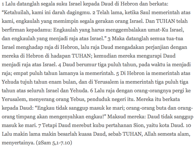Jelas, dari bacaan pertama diperoleh pesan bahwa kekuatan Allahlah yang memungkinkan Daud merebut kubu pertahanan lawan. Kekuatan Allahlah yang memungkinkan Yesus mengusir roh jahat. Jadi, ini bukan karena pertama-tama Yesus menguasai teknik meditasi, hafal jompa-jampi maupun jurus tangan dan kaki, yang bahkan bisa ditirukan oleh munyuk. Kekuatan Allah ini tidak membuat orang jadi sakti mandra (RIP) guna. Atau, kalau toh masih hendak memaki istilah sakti, kesaktian yang diperoleh dari kekuatan Allah ialah kesaktian iman.