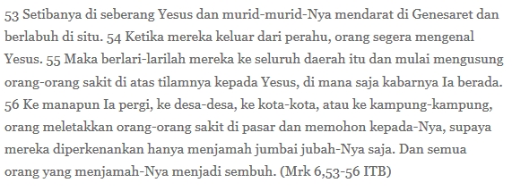 Konon ada tiga puluh kata sepadan dengan touch yang dipakai dalam kisah penyembuhan dalam tulisan Matius, Markus, Lukas: entah penyembuh menyentuh atau disentuh dan penderita sakit mengalami kesembuhan.