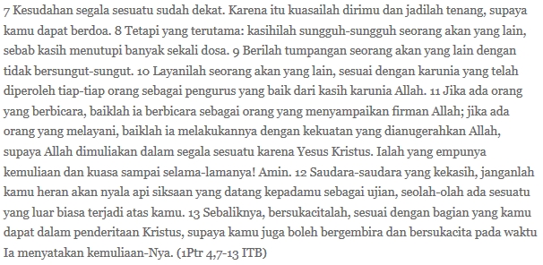 Semoga niat baik itu tidak bernasib seperti penataran P4 yang barangkali bisa dipadankan dengan cerita bacaan hari ini. Ceritanya si guru dari Nazareth itu mengutuk pohon ara yang tak berbuah, yang klop dengan kisah selanjutnya, mereka yang berbisnis busuk dengan tameng religius. Ha njuk hubungannya apa je, Rom, kok digathuk-gathukkan gitu?