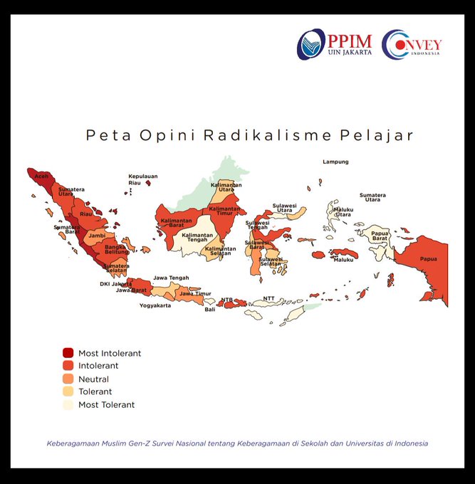 Andaikanlah peta itu berlaku saat ini, itu artinya sejak berdirinya NKRI, benih radikalisme juga ikut tumbuh subur. Secara sepintas terlihat ada lebih dari separuh gagasan intoleran tersebar di kalangan pelajar. Lha, kalau digabung dengan guru atau dosennya dan mahasiswa, tentu angkanya bisa jadi 80%.
