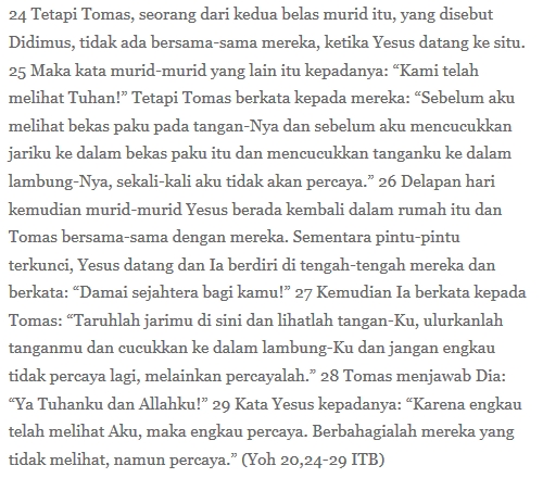 Teks hari ini jelas tidak bicara mengenai martabak. Saya juga tidak hendak membahas martabak, apalagi demo di depan warung martabak [lha judul dan tiga paragraf itu tadi apa, Mo?]. Tomas, murid guru dari Nazareth, yang dipestakan hari ini pun bukan penggemar martabak. Akan tetapi, dari kisahnya terlihat juga adanya fungsi perekat, bukan martabak, melainkan kepercayaan antarmanusia. Mari lihat bahwa hanya dua kali dari tujuh kali pertemuan hadir martabak. Kalau pertemuan itu terjadi cuma karena martabak, tentu lima kali pertemuan lainnya dalam seminggu tak akan terjadi. Peran martabak jadi sekunder di hadapan kepercayaan antarpribadi dan memang itulah yang disarankan guru dari Nazareth itu: setiap orang beriman bisa jadi ‘sumber’ iman orang lain, yang kelak jadi ‘sumber’ iman orang lainnya lagi, tetangganya, temannya, dan seterusnya.
