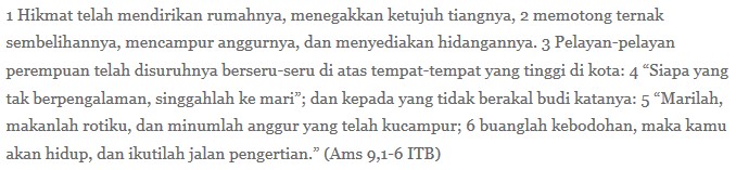 Teks bacaan hari ini, tulisan Yohanes, biasanya segera diasosiasikan dengan ritual Gereja Katolik yang mengasumsikan Tubuh dan Darah Kristus. Saya tidak hendak menyangkal asosiasi itu (saya uraikan pada posting Tubuh Kristus Kok Dimakan) tetapi kiranya perlu memahami secara biasa-biasa saja supaya tidak jatuh pada anggapan takhayul. Saya juga bukan jenis orang yang suka menyembah-nyembah hosti (itu lho roti gandum putih pipih bundar tawar) yang diangkat imam saat perayaan Ekaristi, lha wong ya cetha yang pantas disembah cuma Tuhan Allah. Selain Tuhan Allah itu, ya boleh saja memberi penghormatan tetapi cara saya menghormatinya bukan dengan telapak tangan di samping pelipis atau membungkuk-bungkuk.