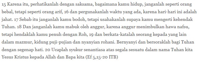 Saya memandangnya saja dan pada saat itu saya bersyukur dan berdoa supaya saya diberi rahmat kekuatan untuk semakin meneladan Pribadi yang hadir dalam wujud roti pipih tawar tadi. Sesederhana itu. Sesederhana saya berusaha mengenal, mengerti, mencintai orang lain lewat solidaritas dengannya: mengenal pandangan hidupnya, mengenal perjuangannya, mengerti misi baiknya, dan bahkan terlibat dalam gerakannya. Saya kira, itulah makna dari makan dan minum tubuh dan darah guru dari Nazareth, tak mungkin jadi kanibalisme (ha kok lé bodo mên punya anggapan begitu, padahal sudah disarankan bacaan pertama: buanglah kebodohan…ikutilah jalan pengertian).