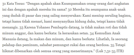 Kalau pokok persoalannya cuma makanan, warna, hobi dan sejenisnya tentu tak ada problem besar. Akan tetapi, persoalan teks hari ini bukanlah sekadar makanan minuman. Ini baper kelas kakap, soal pandangan hidup dan sejak zaman baheula senantiasa ada orang-orang baperan begini: konservatif vs progresif, kiri vs kanan. Yang dibuat guru dari Nazareth itu sebetulnya ‘hanya’ untuk mengembalikan martabat kemanusiaan, tetapi ditentanglah ia oleh kelompok konservatif, tetapi juga disangkal oleh kelompok progresif yang punya agenda lain. Saya tidak hendak bicara mengenai agama atau Gereja lain, tetapi dalam Gereja Katolik, nuansa baperan itu sekarang mulai kelihatan lebih terang. Penglihatan saya muncul dari berita mengenai tuntutan seorang uskup kepada Paus Fransiskus untuk mengundurkan diri. Analisisnya, yang saya cenderung klop, ada pada tautan ini.